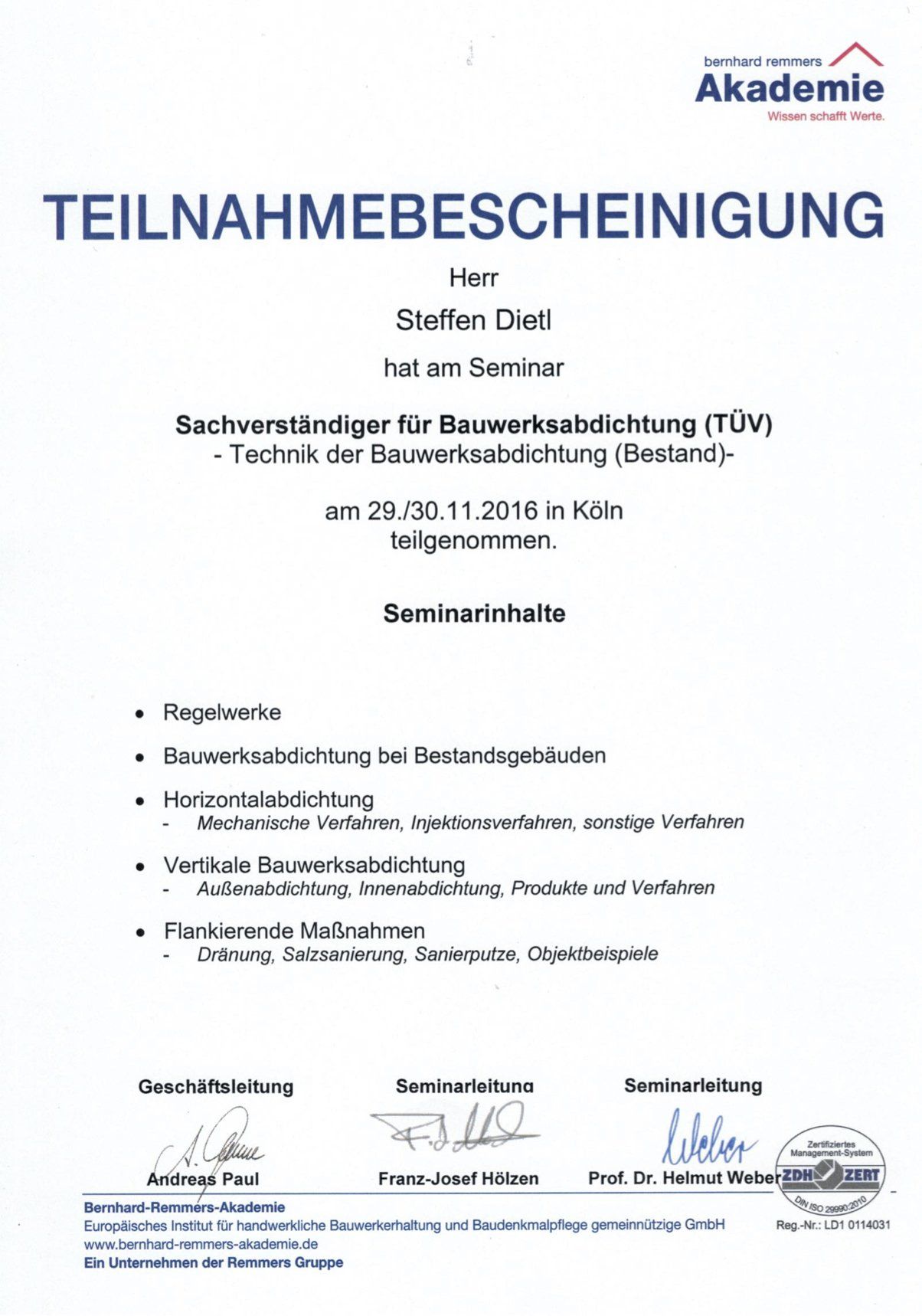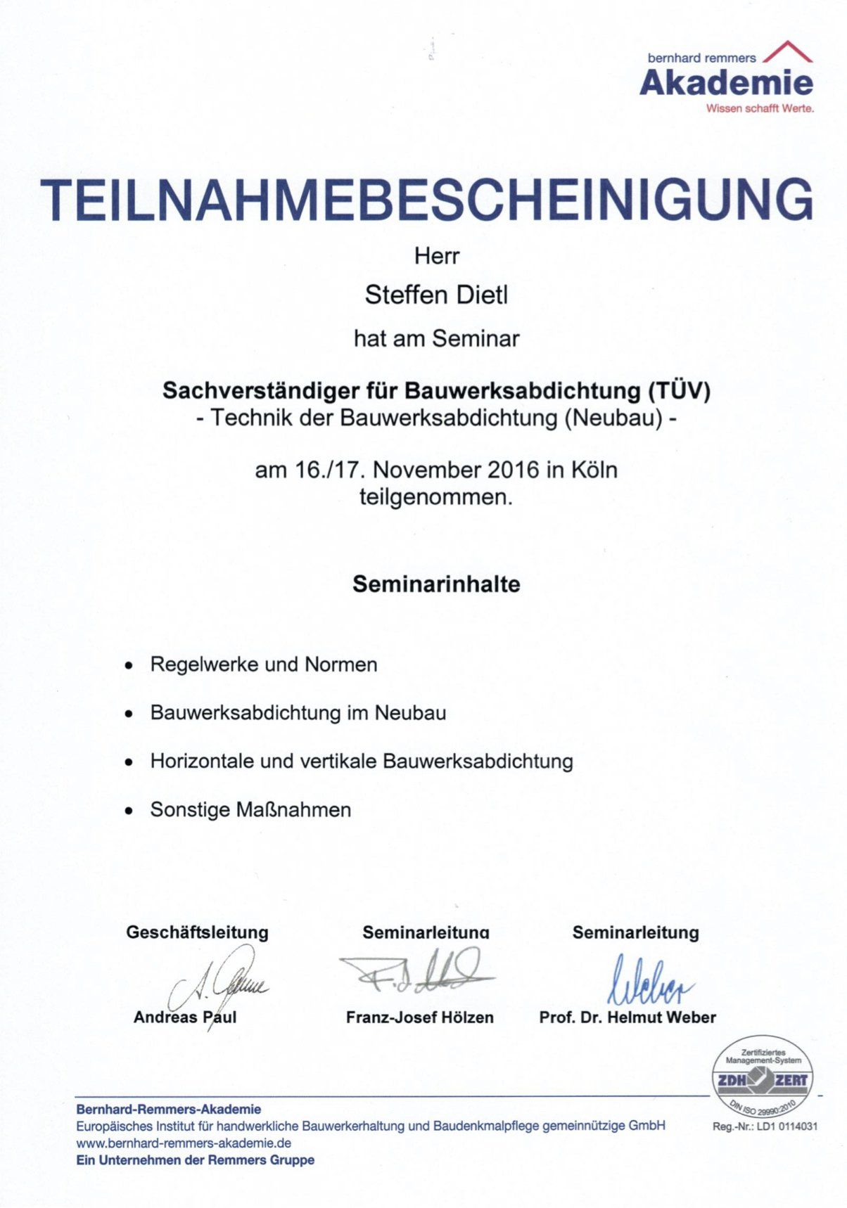 Sachverständiger für Bauwerksabdichtung (TÜV)