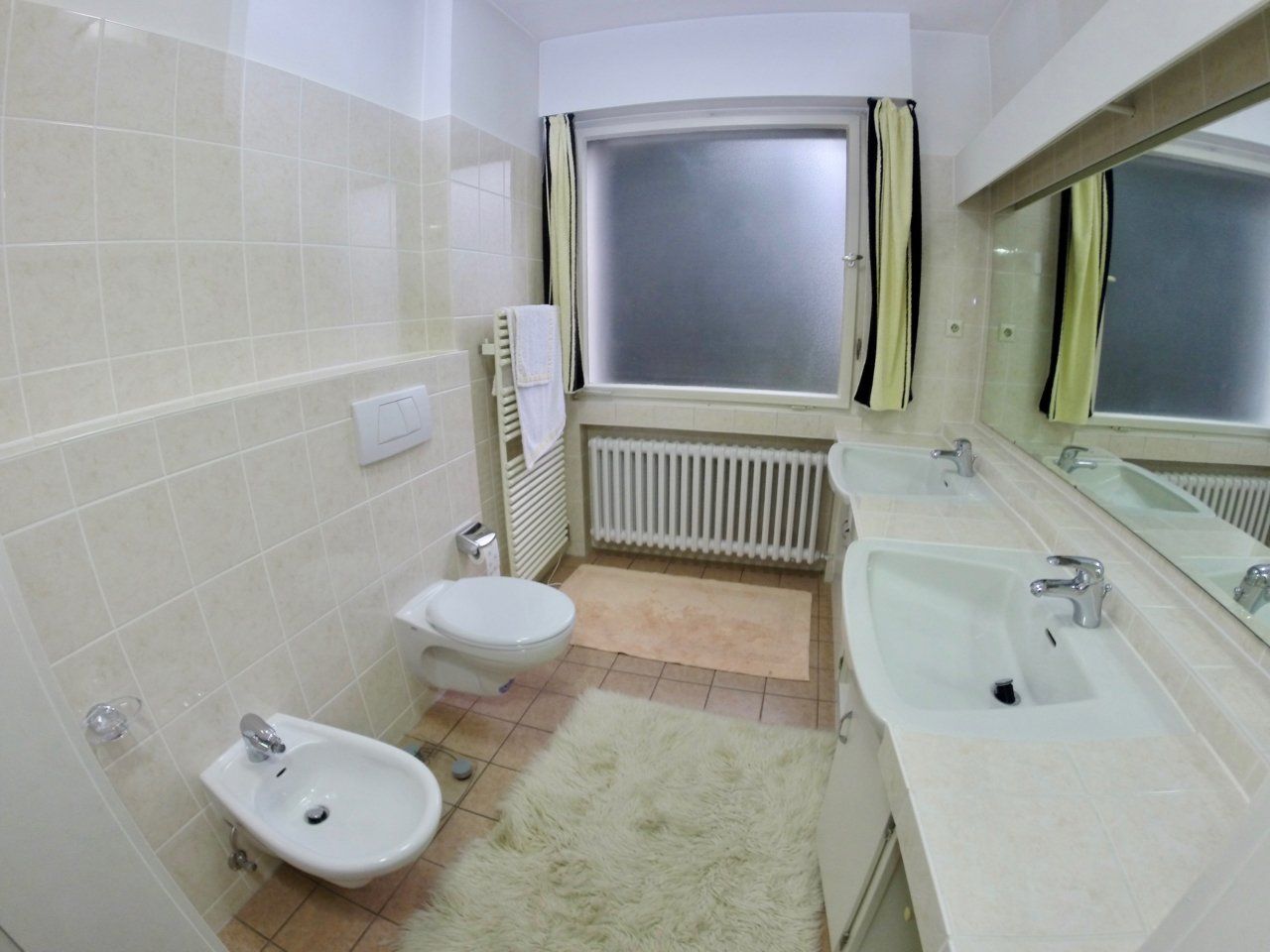 Die Sanitäranlagen im Erdgeschoss (außer das Duschbad) wurden vor einigen Jahren erneuert, entsprechen jedoch nicht mehr dem heutigen, modernen Standard. Es gibt ein Badezimmer im EG mit zwei Waschbecken, Toilette und Bidet und ein weiteres Duschbad im Flur, neben dem sich auch noch ein zusätzliches Gäste-WC befindet.