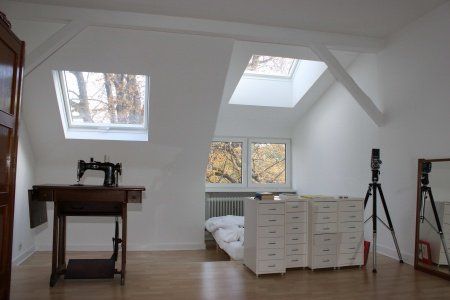 Über eine 5-stufige Holztreppe gelangt man in den oberen Teil der Wohnung. Hier befinden sich das Schlafzimmer, welches mit einer sehr großen neuen Dachgaube ausgestattet ist, die Küche und eine sehr große Abstellkammer, die auch als Kellerersatz dient.