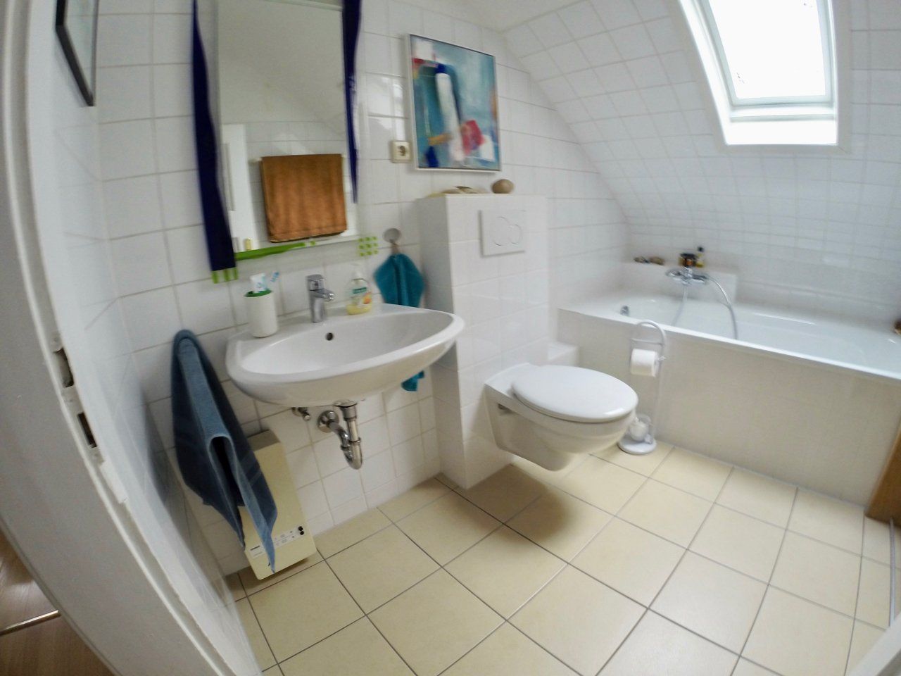 Im unteren Teil der Wohnung befindet sich das Wohnzimmer mit dem angrenzenden Badezimmer mit Dusche. Das Badezimmer wird im Januar 2018 saniert. Hierbei wird unter anderem auch die Badewanne durch eine Dusche ersetzt. Ein neuer und moderner Fliesenspiegel wird ebenfalls verbaut. Auf den Photos ist das Badezimmer der Nachbarwohnung zu sehen. Das Bad dieser Wohnung wir in ähnlichem Stil erneuert.