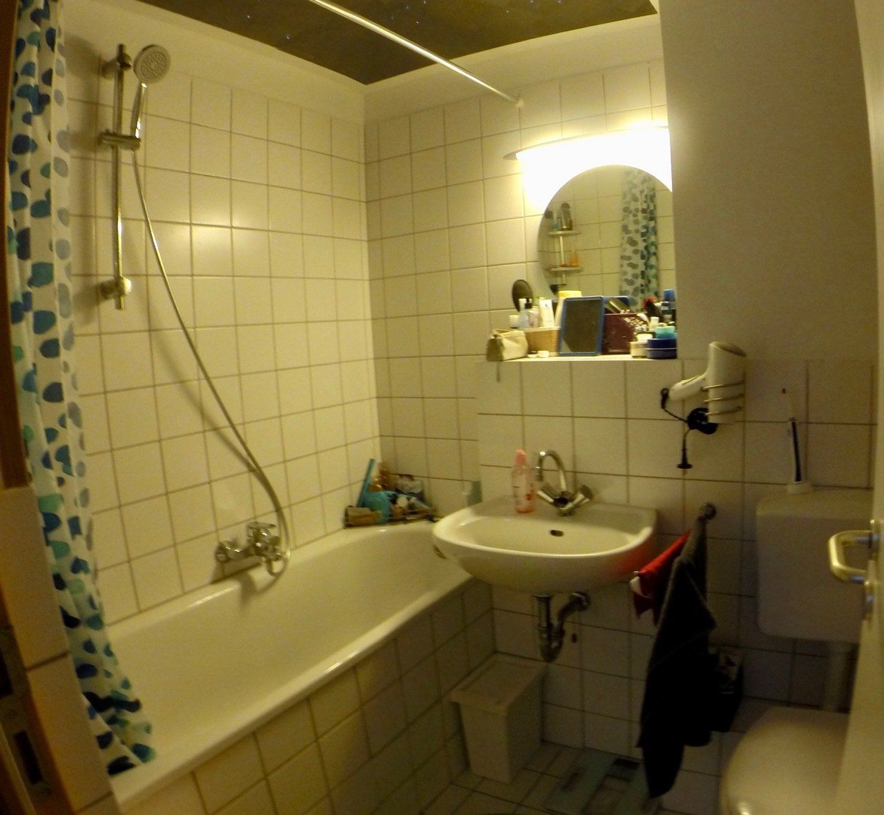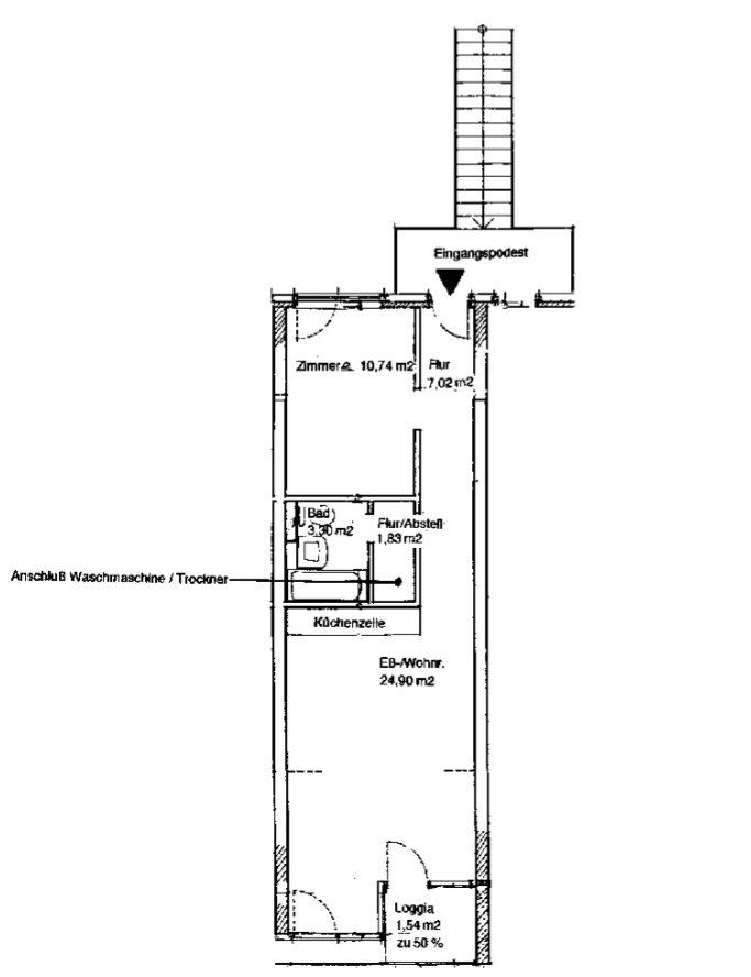 Ein Schlafzimmer und eine Wohn- Eßzimmer mit integrierter Küche, fensterloses Badezimmer mit Wanne, Flur mit kleiner Abstellkammer und Waschmaschinenanschluss, ca. 1,5 m2 große Loggia