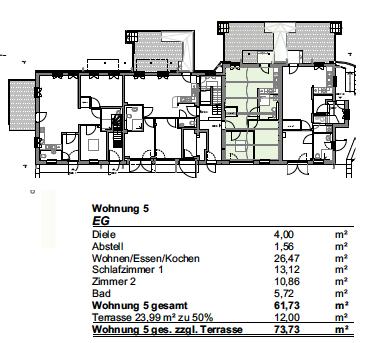 Die Wohnung selbst hat eine Größe von ca. 62 m². Hinzu kommt noch eine Terrasse mit einer Fläche von ca. 24 m², welche anteilig mit 12 m² zur Wohnfläche hinzugefügt wird, so dass eine Gesamtwohnfläche von ca. 74 m² zur Verfügung steht.