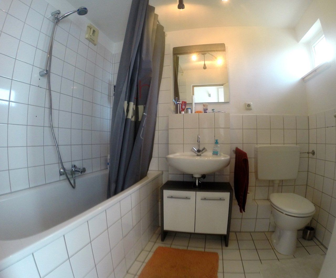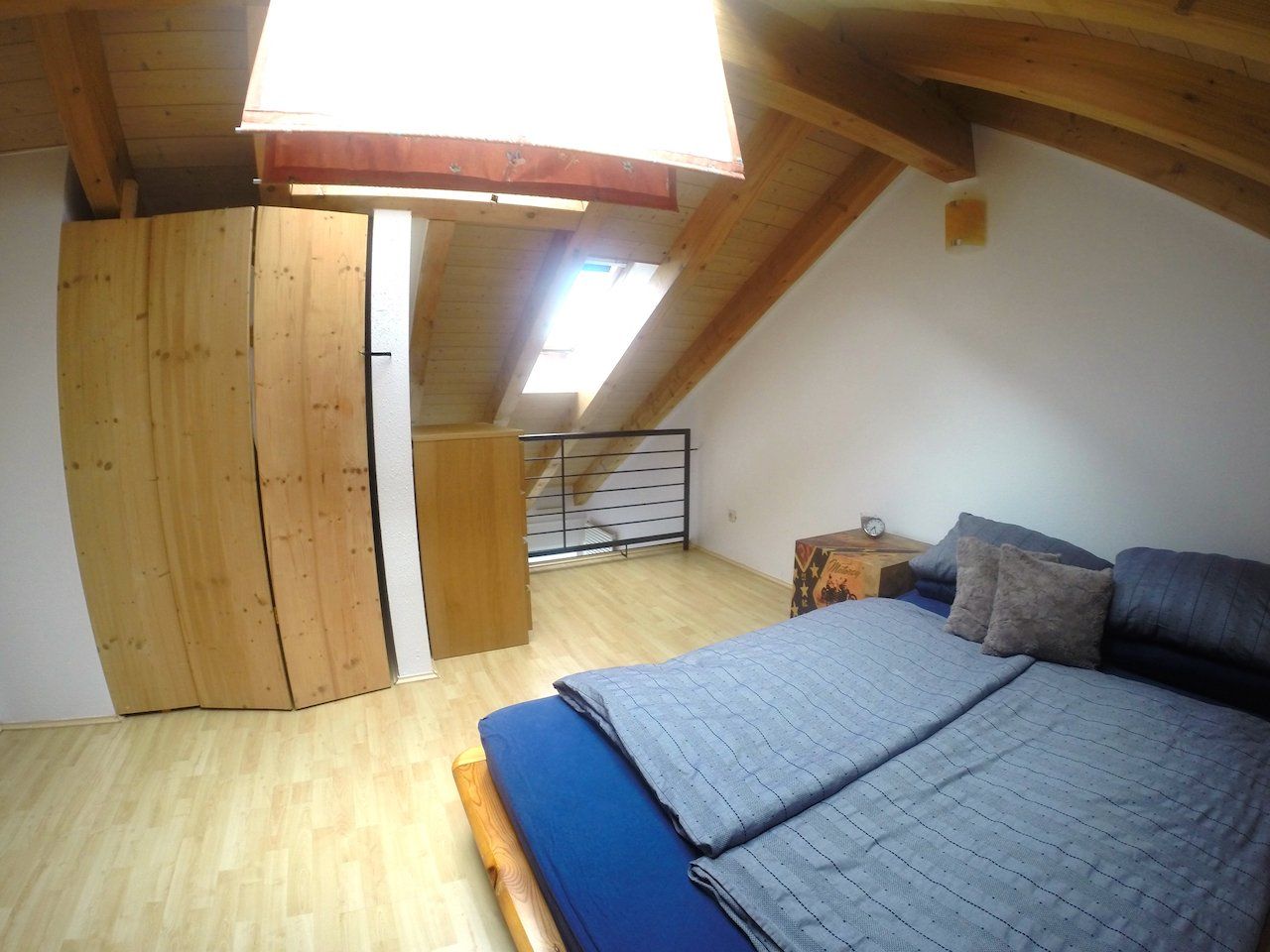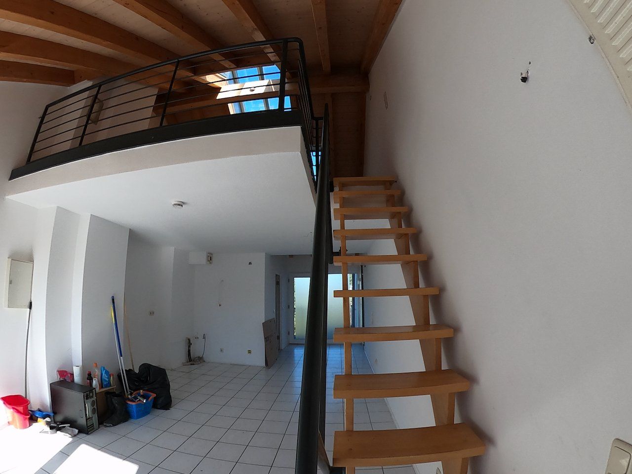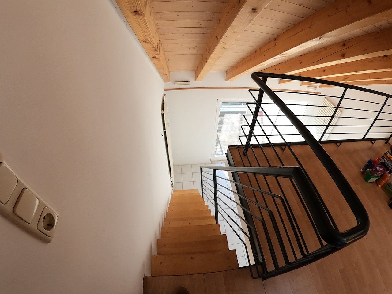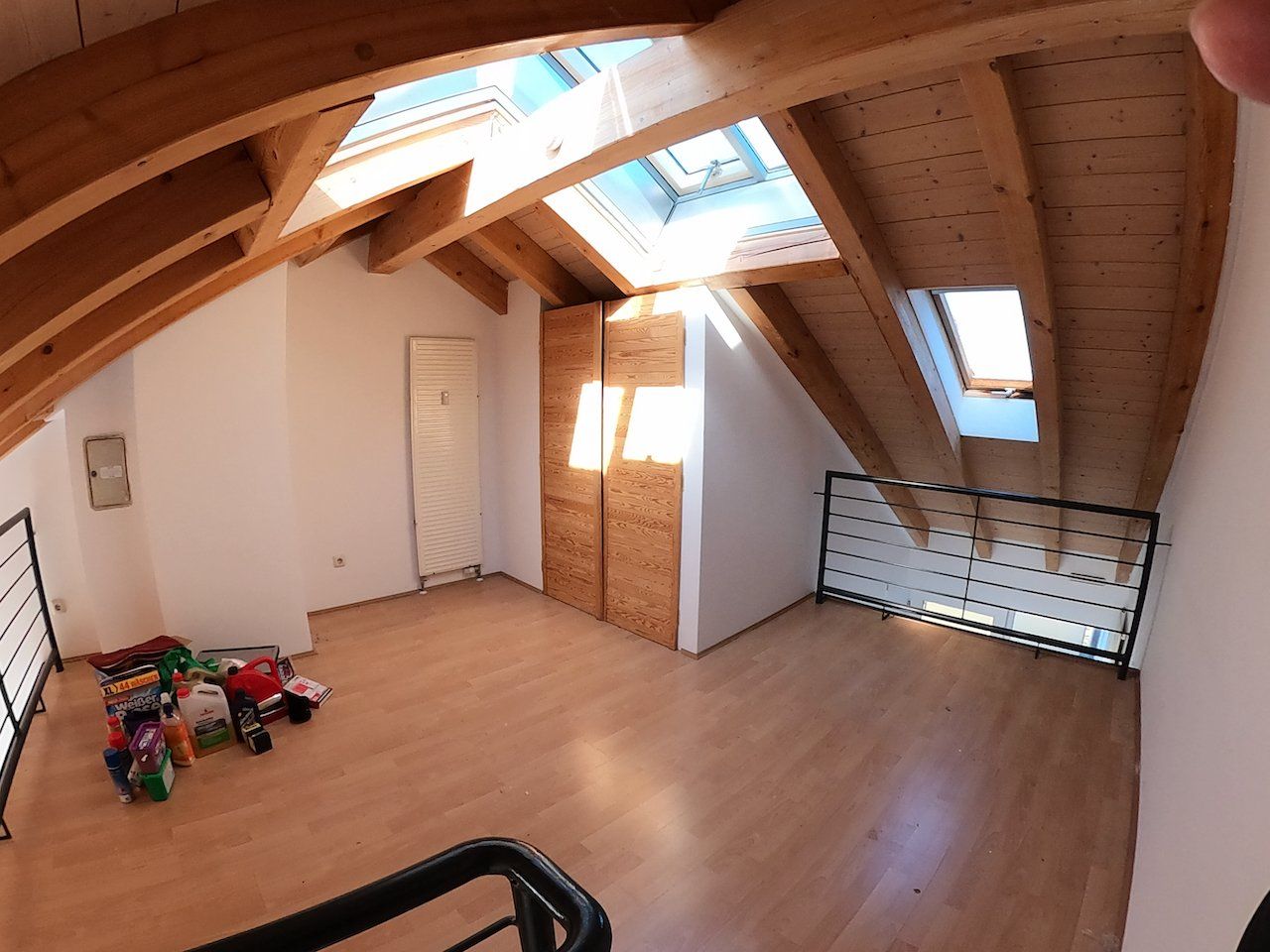 2. Etage: Großer Wohnbereich mit Zugang zum ca. 7 m² großen Balkon; im Wohnzimmer befindet sich eine Holztreppe, welche auf die offene Galerie in der 3. Wohnebene mit sichtbarem Holzbalkenwerk führt (derzeit als Schlafbereich genutzt); Badezimmer mit Wanne und Fenster (nicht zu öffnen) rechts neben dem Eingangsbereich. Auf der Galerie findet man auch einen Stellplatz für die Waschmaschine.