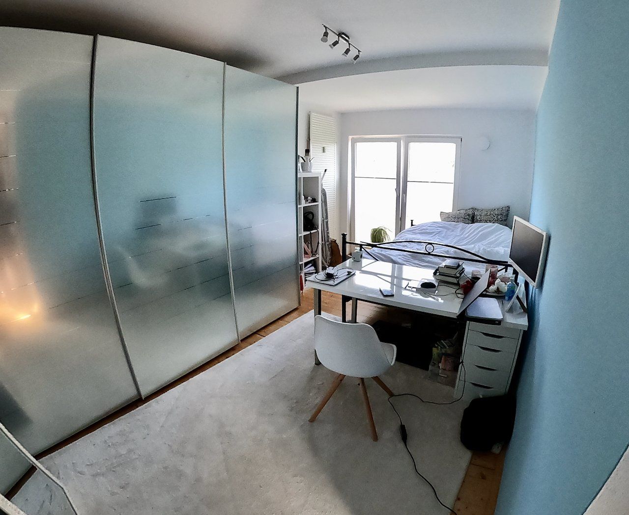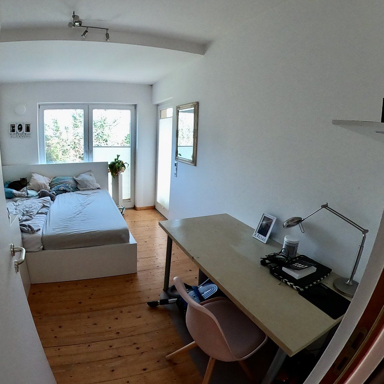 Zwei Schlafzimmer, ein Wohnzimmer, ein Arbeitszimmer, Küche mit integrierter Essecke, fensterloses Badezimmer mit Wanne, kleine Abstellkammer mit Waschmaschinenanschluss, ca. 3,4 m² großer Balkon zur Südseite des Hauses, welcher sowohl vom Wohnzimmer als auch vom Schlafzimmer aus zu begehen ist. Das zweite Schlafzimmer hat einen Zugang zur kleinen Loggia auf der Nord-Ost-Seite.