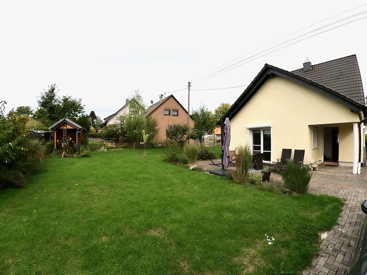Für Fahrräder, Gartengeräte usw. finden Sie im Garten einen Geräte-Schuppen vor.