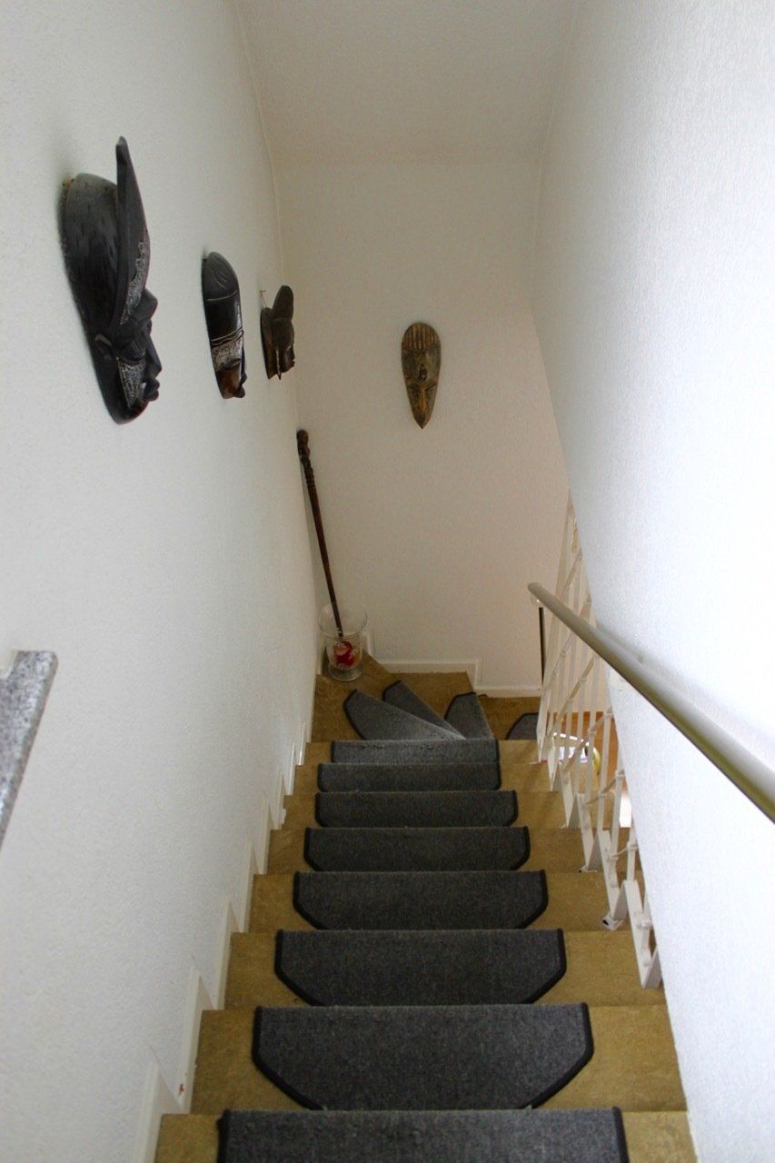 Über eine mit Teppich belegte Treppe gelangt man ins Obergeschoss, welches wie folgt unterteilt ist: Flur mit sehr schönem hellen Dielenboden, Schlafzimmer 1 (ebenfalls mit Dielenboden), Kinderzimmer (mit praktischen Einbauschränken in der Schräge), sehr kleines Schlafzimmer/ Arbeitszimmer (ca. 2,3 m x 2,8 m = 6,5 m² ), Badezimmer mit Wanne und Dusche. Rolladen sind hier nur in Schlafzimmer 1 vorhanden.
