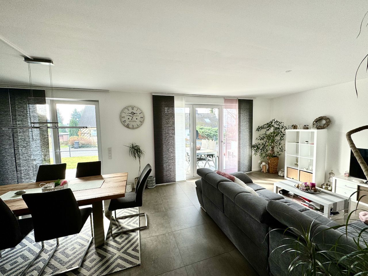 Vom Wohnzimmer mit offener Küche gelangt man auf die Terrasse (ca. 22 m²) mit Süd- bis Südwestausrichtung und angrenzenden kleinen Garten.