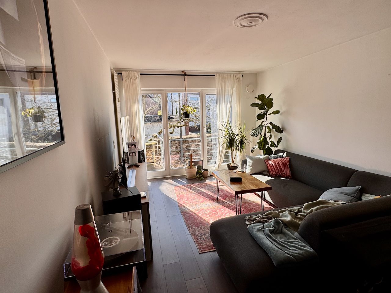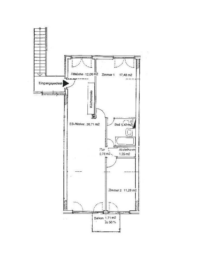 Zwei Schlafzimmer und ein Wohnzimmer, Küche mit integrierter Essecke, fensterloses Badezimmer mit Wanne, kleine Abstellkammer mit Waschmaschinenanschluss, ca. 3,4 m² großer Balkon zur Südseite des Hauses.